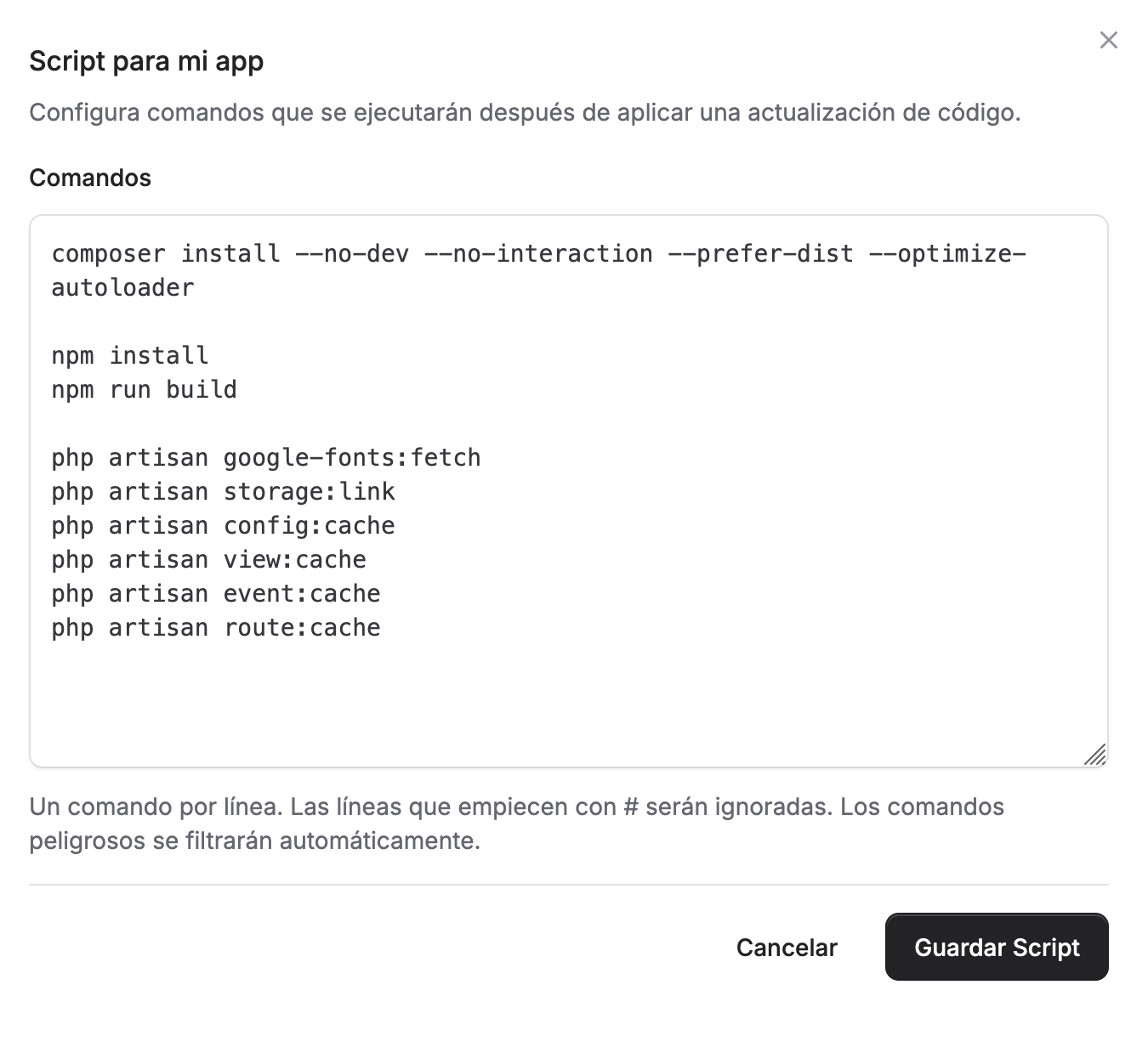 La mayoría de proyectos necesitan ejecutar comandos durante el deploy para instalar dependencias o compilar assets. Accede al editor haciendo click en el menú del repositorio (tres puntos) → Editar script.