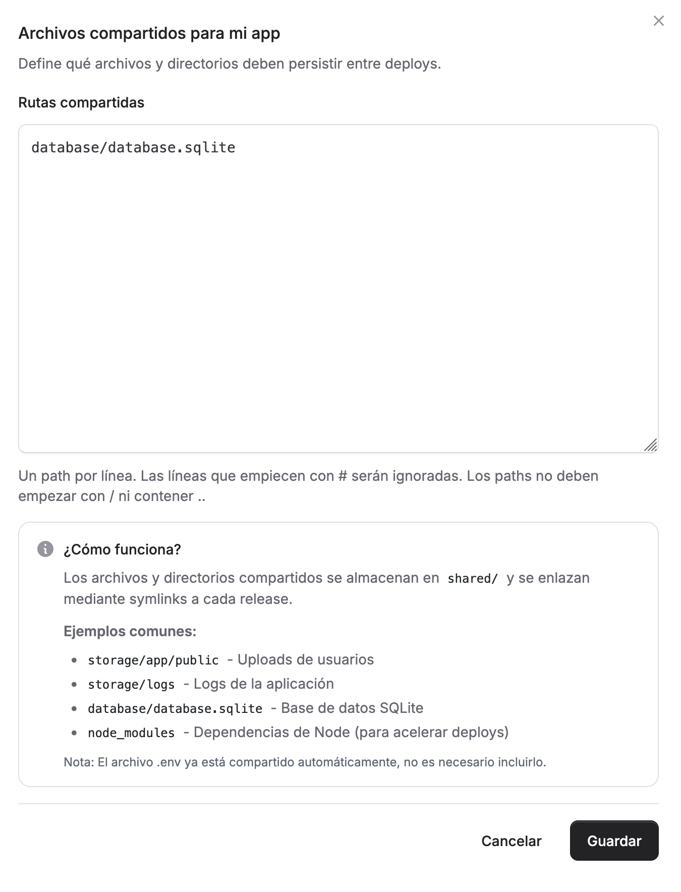 El archivo .env se preserva automáticamente entre deploys. Para compartir archivos o carpetas adicionales, accede a Archivos compartidos (menú → Archivos compartidos) y especifica las rutas relativas, una por línea.