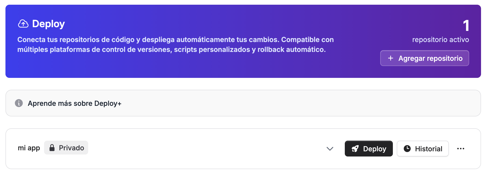 Al hacer click en Agregar Repositorio, el sistema verifica el acceso SSH (activándolo automáticamente si es necesario), valida la configuración y guarda el repositorio. Ahora aparece en la lista con un botón Deploy.