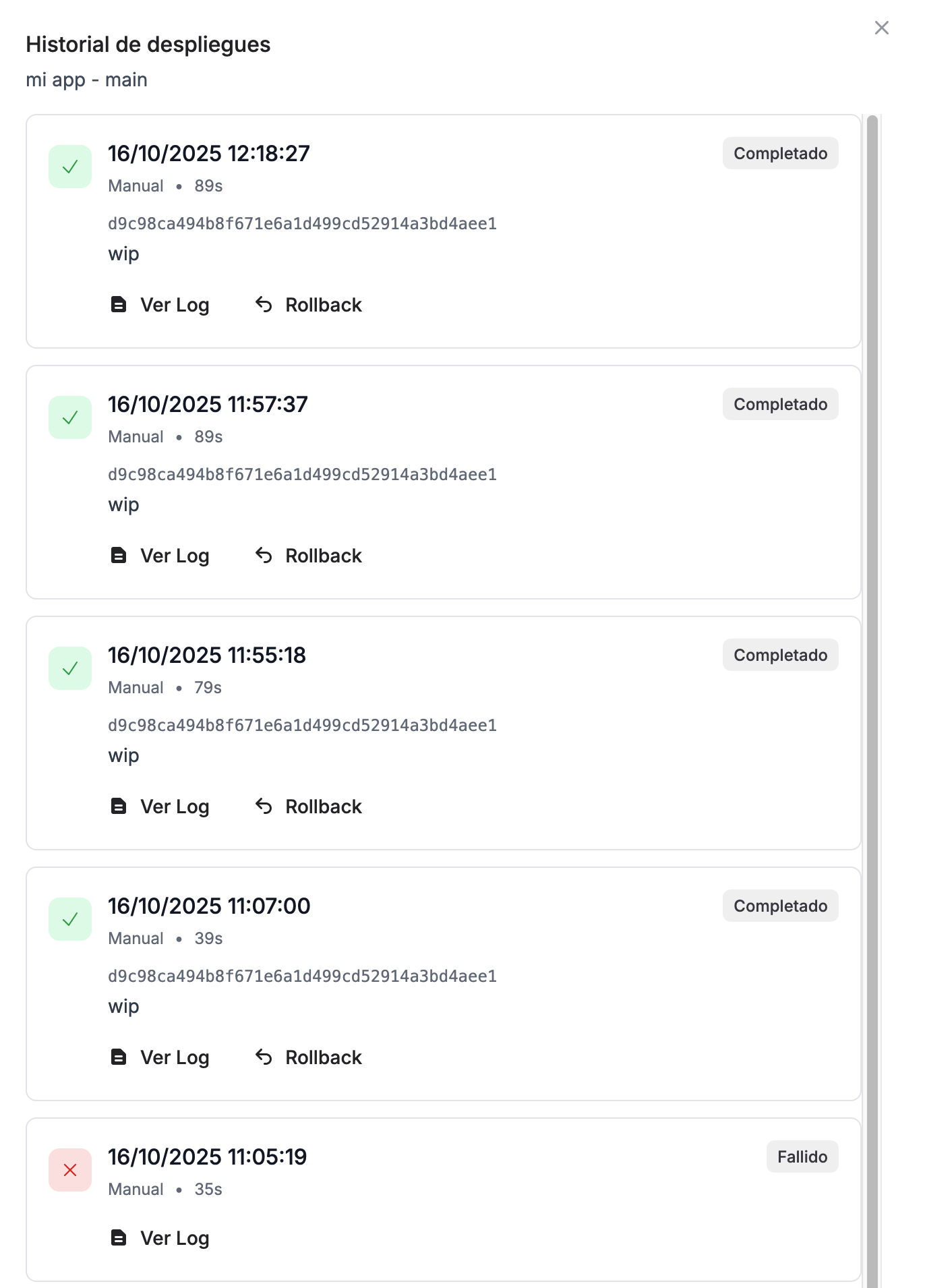 El Historial muestra todos los deploys con fecha, forma de ejecución (manual/webhook/rollback), commit desplegado, duración y estado. Haz click en Ver Log para ver el output completo y depurar problemas.